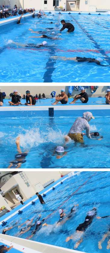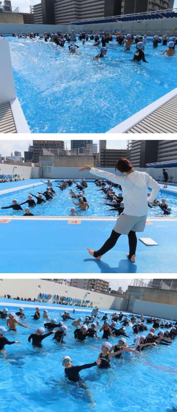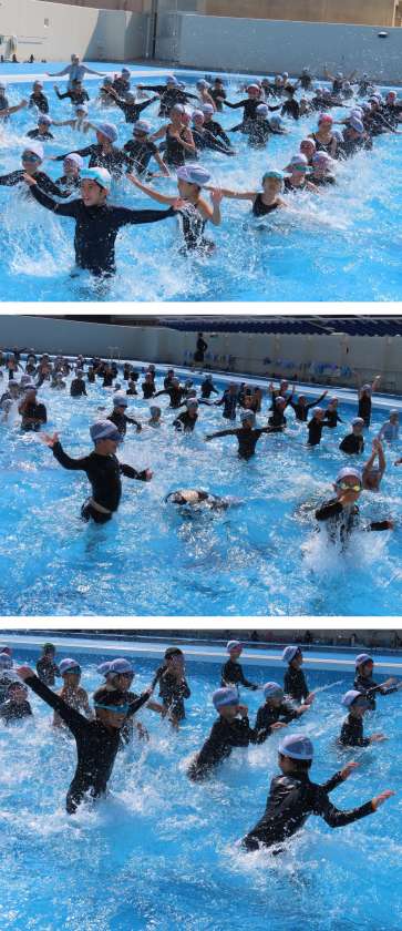 音楽に合わせて準備体操をしたあと、けのびやバタ足の練習をしました。