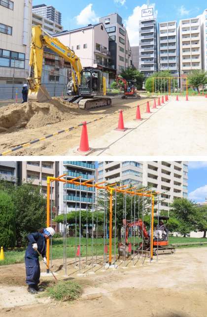鉄棒や登り棒のところに土を入れ、整地作業が始まりました。
