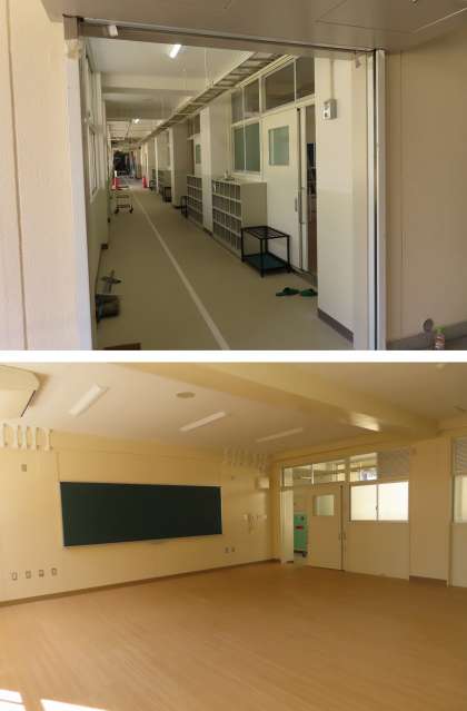 旧給食室や旧いきいき教室を普通教室にする工事も、ほぼ終了しています。