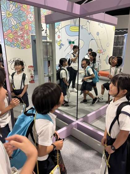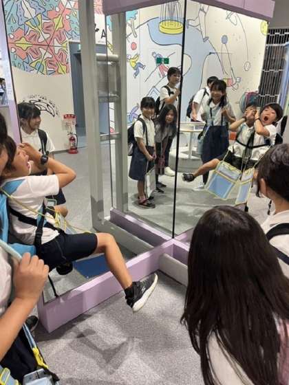 ご飯を食べた後は科学館の館内を楽しみました。月の満ち欠けの学習、鏡に映ると浮いているように見える自分の姿を楽しみました。