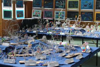 学年のそれぞれのスペースに並べられ、子どもたちの思いがいっぱい詰まった作品は、輝いて見えます。日吉小学校の講堂が、元気がはじける美術館になりました。