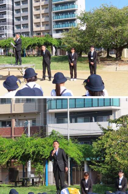 そこで、今日はまず職員室で、副校長先生と昨日から来られている教育実習生を教職員に紹介し、そのあと、運動場で、子どもたちにも紹介して、一人ずつあいさつをしてもらいました。