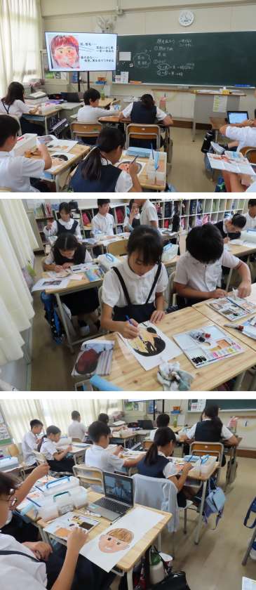 5年生が、水彩画で自分の顔を描いていました。