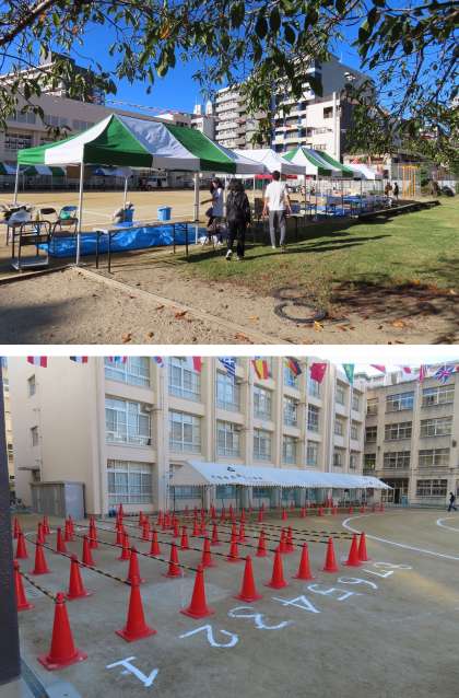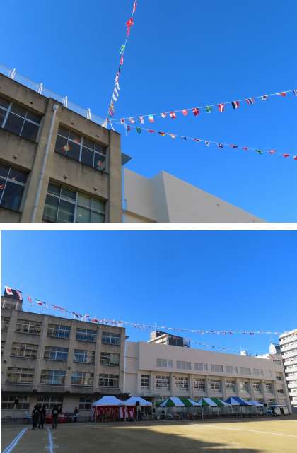 昨日、地域の方が学校に来られて、万国旗やテントを張ったりして準備をしました。