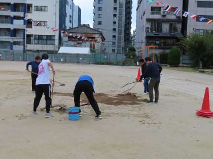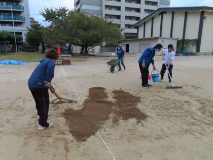 地域の方も駆けつけてくださり、教職員と一緒にグラウンドの水を吸い取ったり、土を入れたりしています。