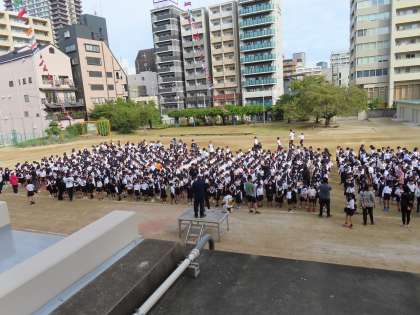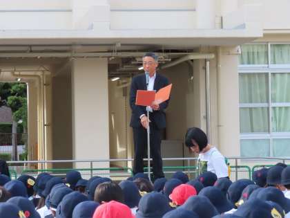 今日の全校朝会では、また朝礼台を元に戻し、いつもの通り行いました。