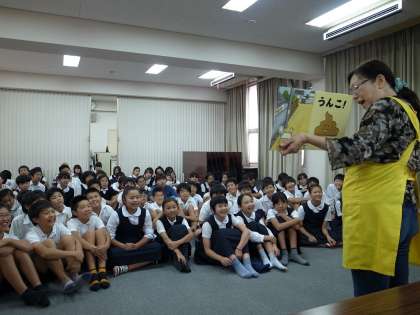 今日はPTA読み聞かせクラブ「おひさん」が6年生へいろいろな本を読みました。大型絵本や笑える本、歌も一緒に歌いましたよ!!