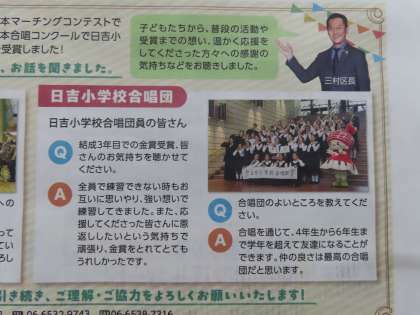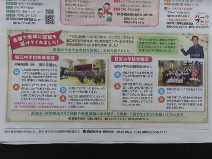 『かぜ』1月号の3面下に、『音楽で地域に感動を届けてくれました!』という見出しで日吉小学校合唱団と堀江中学校吹奏楽部の記事が載っています。