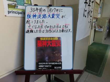 今日の全校朝会では、平成7年1月17日に起こった『阪神淡路大震災』についての話をしました。