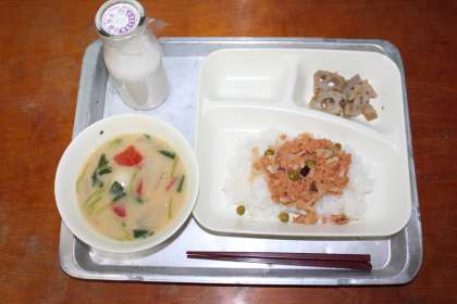今日から給食が始まりました。新学期二日目から温かい給食がいただけ、子どもたちもほっこりしたことでしょう。今日の献立は、