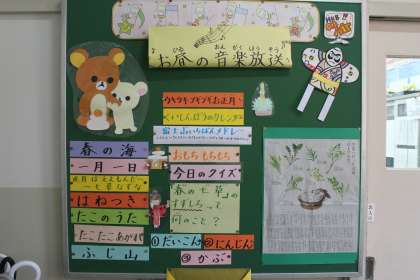 また、今日のお昼の音楽放送も、お正月メニューでした。春の七草も題材に、お正月にちなんだ歌がたくさんかかりました。曲名は、写真のとおりです。大人には懐かしい選曲でしたが、子どもたちは初めて聞く曲が多かったかもしれませんね。