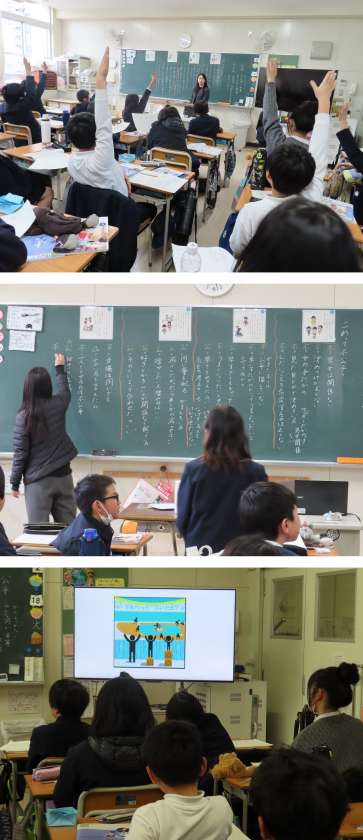 学校生活でよく見られる4つの場面について、子どもたちが隣同士で話合ったり、みんなの前で発表したりして意見交流をしていきました。