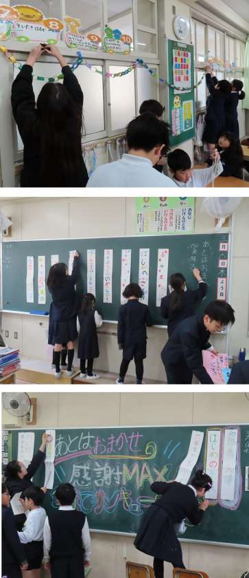 6年生が講堂で、卒業式の練習をしている間、各教室では飾りつけをしたりプログラムを貼ったりしました。