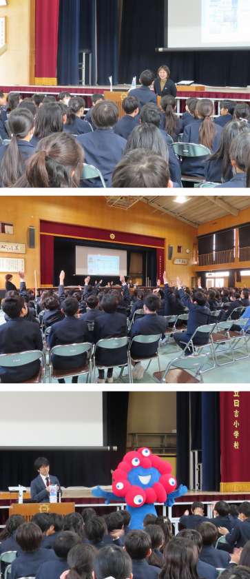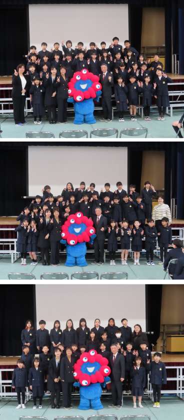 子どもたちは、お礼に「チャレンジ」という曲を歌い、クラスごとにミャクミャクと写真を撮って終わりました。