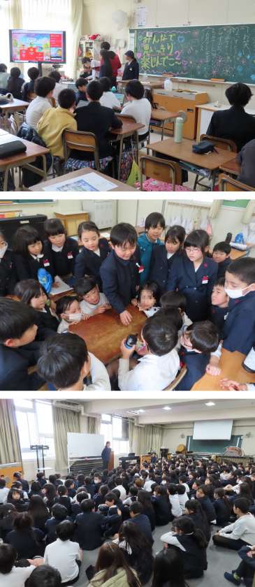 ・学年集会を開いて、先生が一人ずつ今年一年をふり返って、子どもたちに語りかけている学年