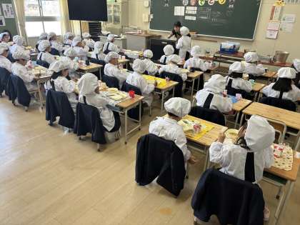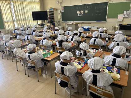 今日は小学校での初めての給食です。6年生のお兄さんお姉さんが給食室からの運搬と配膳を手伝ってくれました。
