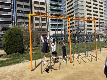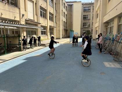 今日は新しい学年になって初めての休み時間です。とても良いお天気で暑さを感じるほどでした。多くの子どもたちが運動場で遊んでいました。上り棒、一輪車と竹馬で遊んでいるみなさんです。