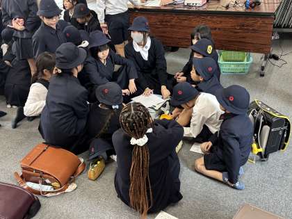 各班では、自己紹介や、集団登校の様子や反省について話し合いました。危険な場所や遊んではいけない場所などを確認し合って、安全に集団登校ができるように班長さんと副班長さんが話し合いをすすめていました。話し合いの後は集団登校での並び方の確認をしました。