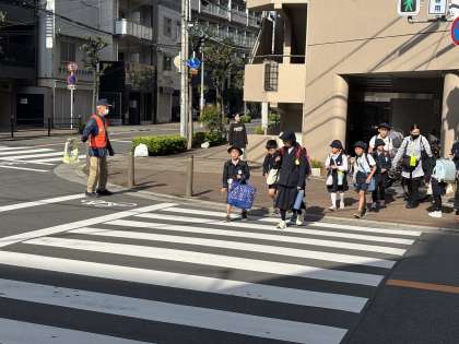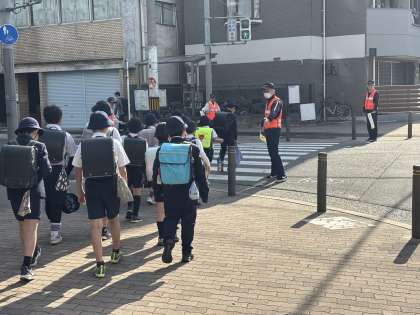 今日登校時の集団登校の様子を見ていると、見守り隊の方々に元気よくあいさつをしている姿が見られました。