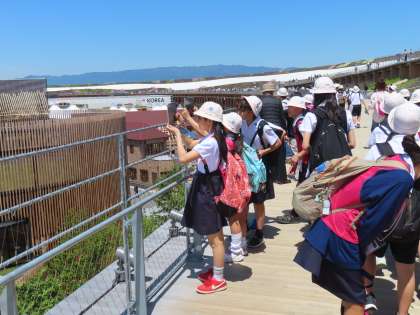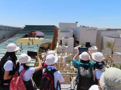 歩きながら、海外のパビリオンや会場の景色をタブレットで撮影しているグループもいました。