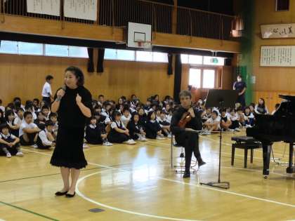 最初に塚本さんから、「音楽は一枚の絵と同じです。絵には必ず額と周りにふちがありますが、絵は私たち演奏者、ふちは児童のみなさん、額はこの日吉小学校の講堂です。私たちと皆さん一緒に絵を作りましょう!!」という言葉から演奏会が始まりました。