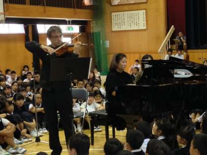 今日の3時間目は、プロの音楽家二名を日吉小学校にお招きし講堂で特別授業をしていただきました。プロの音楽家は日本のピアニスト塚本眞規さんとルーマニアを代表するバイオリニスト、ダヌーツ・マーニャさんです。