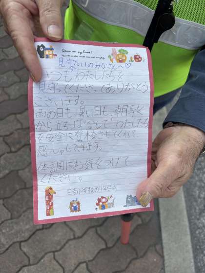 朝、校区を回っていると、見守り隊の方から「これ見てください、登校している子からお手紙をもらったよ」と見せていただきました。