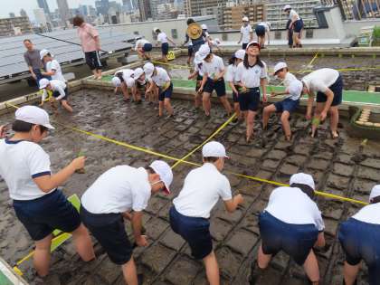 担当者の方に伺いますと、この土は人口土壌で、通常の田んぼの土より軽量だということです。屋上なのでできるだけ軽くする必要があるためだそうです。