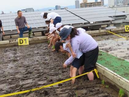 また、苗は福井県の「ササニシキ」を農家の方から送っていただいており、完全無農薬で育てます。ある程度育つとネットをかけて、野鳥の被害を受けないようにするそうです。そうした作業は日頃のお世話をされる、担当者の方々にしていただきます。