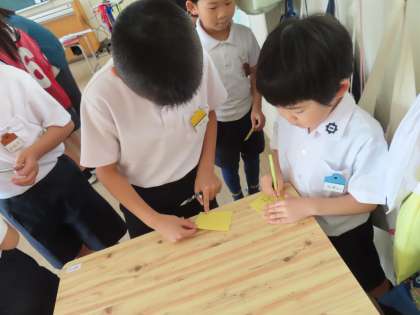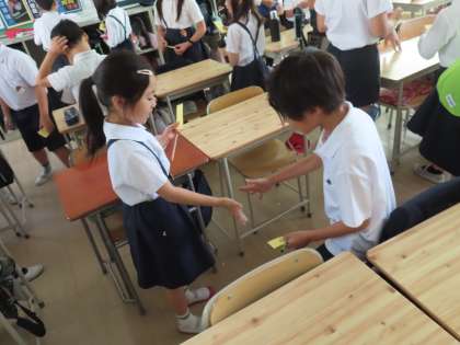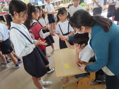 お互いの名前を覚え仲良くなるために、全員がカードを持って歩き、二人組になったらじゃんけんし、勝ったらサインをもらうゲームをしました。