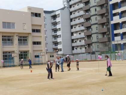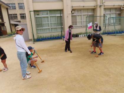 子どもたちと地域の方々、保護者のみなさんがグランドゴルフを通して交流を図る、素敵なひと時です。中にはホールインワンを決める、女子ゴルファーのような女の子もいました。