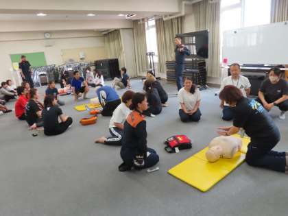 西消防署の消防士の方々から直接アドバイスをいただきながら、参加者全員が胸部圧迫とAEDの操作を行いました。(受講する教職員全員が実技を行うため、2日に分けています。)