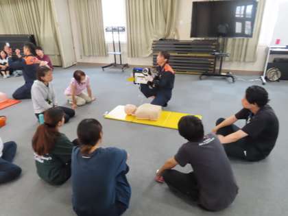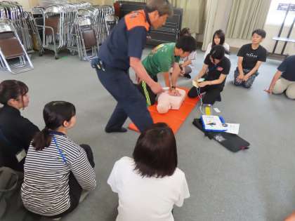 1時間程度の救命救急についてのビデオを視聴した後、AEDを使用した心肺蘇生法の実技を交代で行いました。