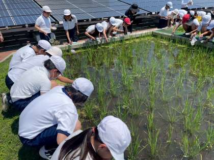 その水田にいる生き物を観察するために、ハグミュージアムの屋上に行きました。