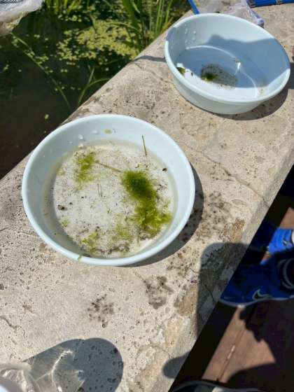 多目的ホールで説明を聞いた後、水田にいる生き物を小さな網ですくい採集しました。