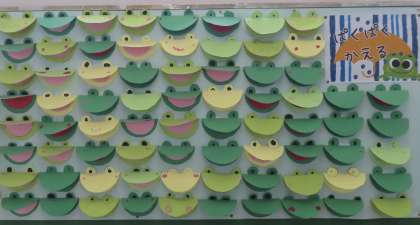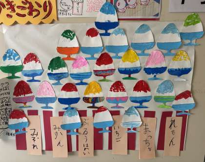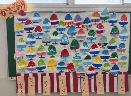 廊下階段の学年掲示板に涼しげなデザートを見つけました!カエルも食べたいようですね。