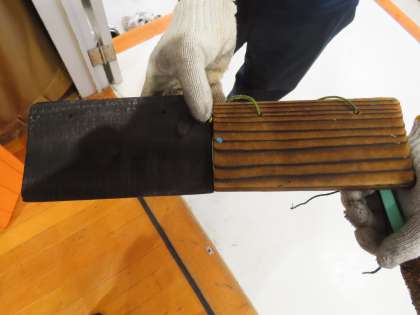 焼き板が2枚並んでいる画像は、右が磨き終わった焼き板です。