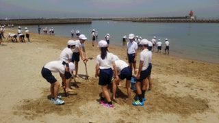 砂の造形活動は力作がそろいました。赤ちゃんガメを連れた海ガメ、日吉の校章、モアイ像…。どれも工夫を凝らした素敵な作品でしたが、大人の投票の結果、一位は前方後円墳に決まりました。