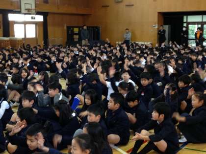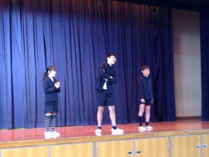 など、子ども達が考えた問題を3択クイズで出していました。集会委員による漫談にも子ども達は歓声を上げ、楽しいひと時を過ごしました。
