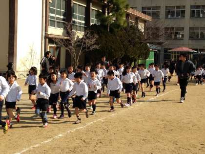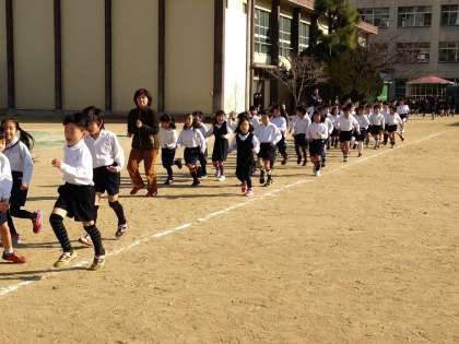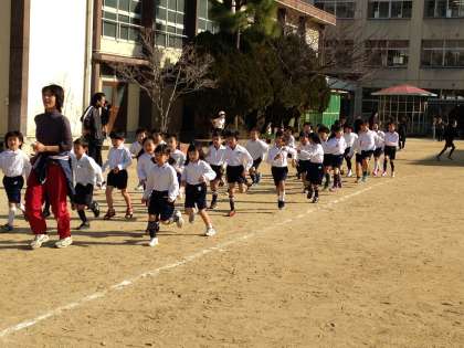 初日の今日は1・2年生の低学年です。みんな元気いっぱい。上着を脱いで準備体操の後、走り始めました。白い息をはきながら、担任の先生を先頭に元気に走っていました。