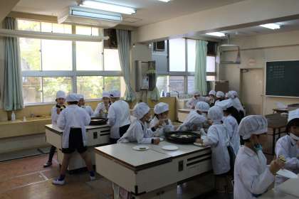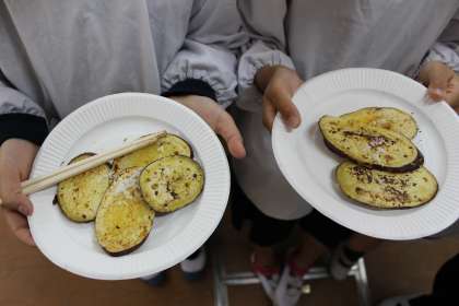 2年生が“おいもパーティー”を開きました。輪切りしたさつまいもをホットプレートで焼き、そのまま食べたり塩をまぶして食べたりします。どの子も笑顔いっぱいで、「おいしい、おいしい」と食べていました。