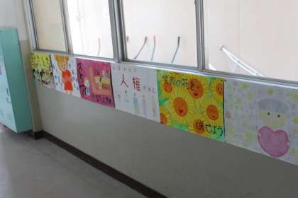 職員室横の廊下に、5年児童が描いた人権ポスターを掲示しています。スペースの都合上、全員分ではありませんが、ご来校の際にはぜひご覧になってください。