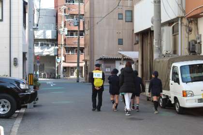 今日の5・6時間目、5年生が『子どもの防犯力UP学習』に取り組みました。区役所や警察、地域の方々などにご協力いただき、校区の安全マップを自分たちで作成する学習です。5〜6人の班に分かれ、校区地図を持って、徒歩で調べました。