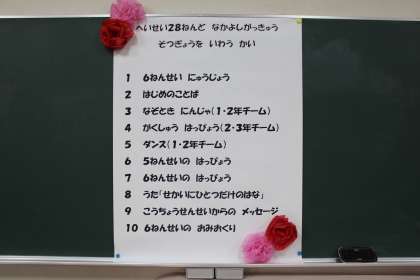本日の2時間目、なかよし学級の卒業を祝う会を行いました。子どもたちの一生懸命な姿を、教職員だけでなく保護者の皆様にもご観覧いただきました。