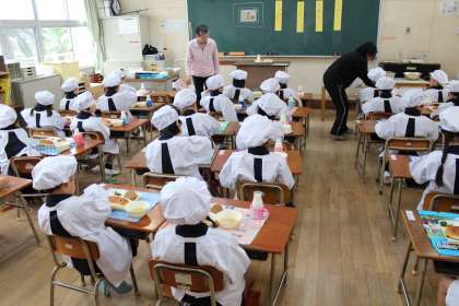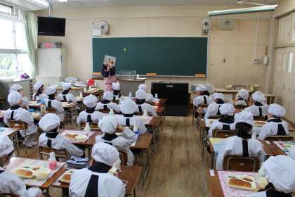 本日から給食が始まりました。入学したばかりの1年生にとっては初めての給食です。ナフキンの敷き方やエプロンの着方などをみんなで覚えた後、6年生が配膳してくれた給食を食べました。牛乳キャップのあけ方に少し苦労している子がいましたが、「おいしい、おいしい」と食べている子が多かったです。