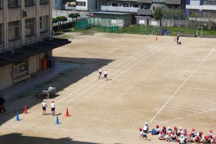 本日の1・2時間目、5年生が体力テストを行いました。もうすぐ始まる校舎増築工事で運動場が狭くなるため、運動場で計測する種目を中心に行いました。