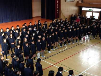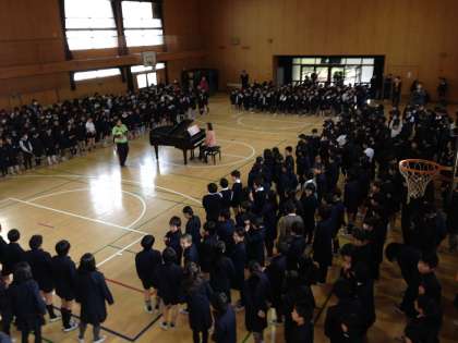 日吉小学校では月に一回、講堂で全校児童がロの字型に集まり音楽集会を開いています。