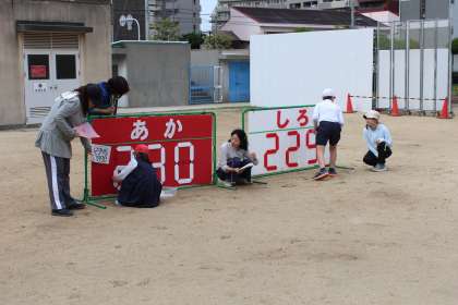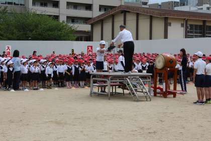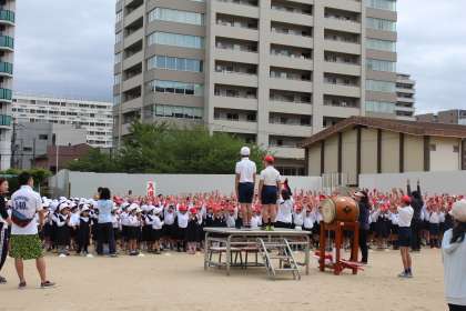 今朝の運動会全体練習では、閉会式の練習をしました。本番さながらに、紅白の学年順に整列して練習しました。