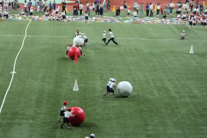 今回は2年生です。短距離走と大玉ころがしの様子です。