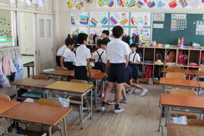 今日(1日)の朝はベストフレンド班活動でした。9日(金)のなかよし遠足(全校遠足)に向けての1回目の取り組みで、当日の並び方や遊びの内容を決めました。